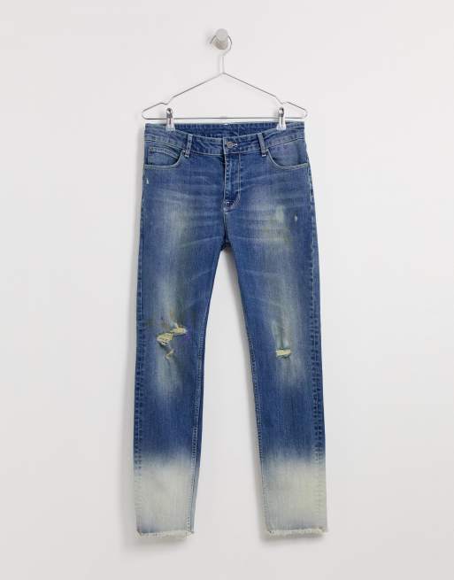 Asos Design Skinny Jeans In Ombre Bleach Wash With Knee Rip